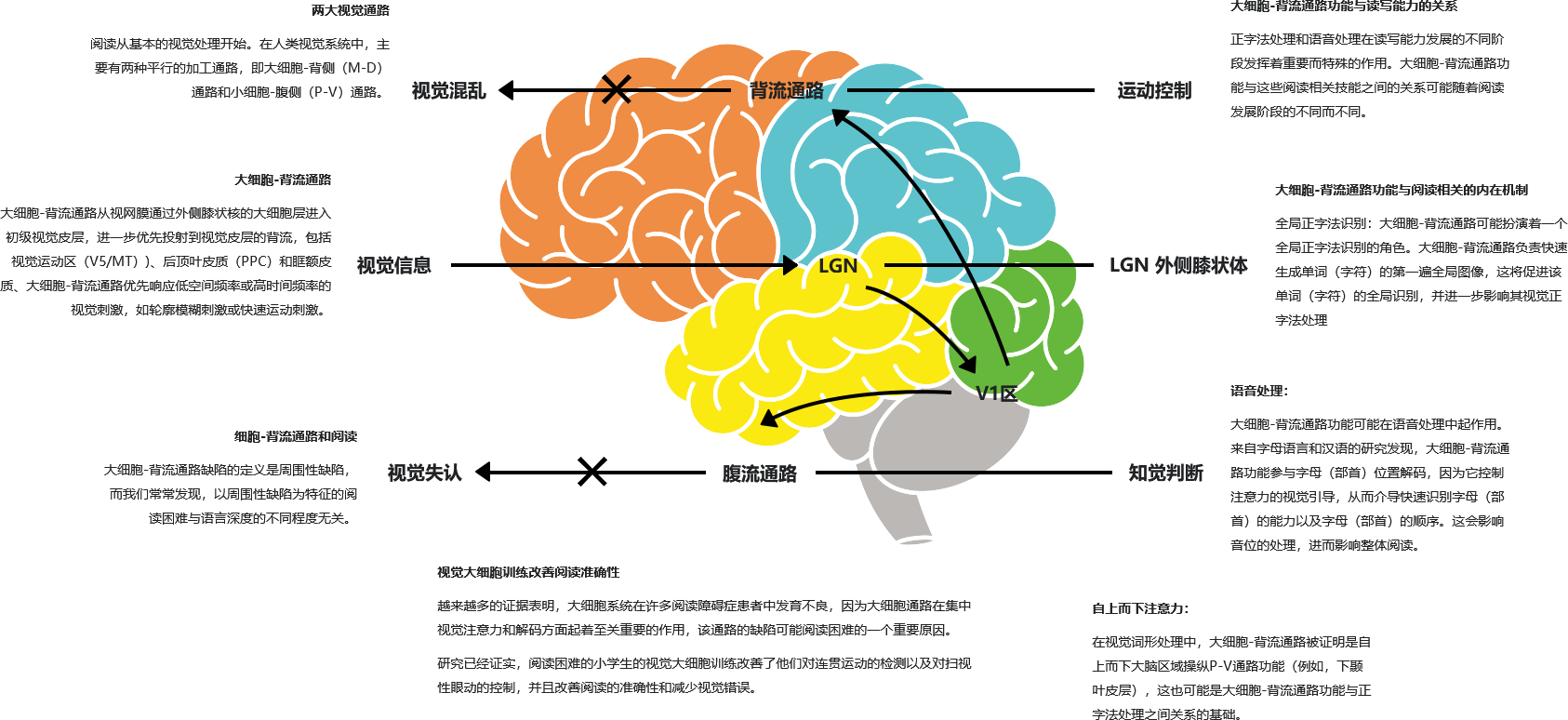 其中的背侧通常称为“背流”。它从大细胞系统接收90%的视觉输入,并投射到视觉运动敏感区域,然后投射到后顶叶皮层。因此,这一途径调节运动知觉和物体定位,并在引导视觉注意和眼睛运动控制中发挥重要作用。所有这些功能对阅读都至关重要。
